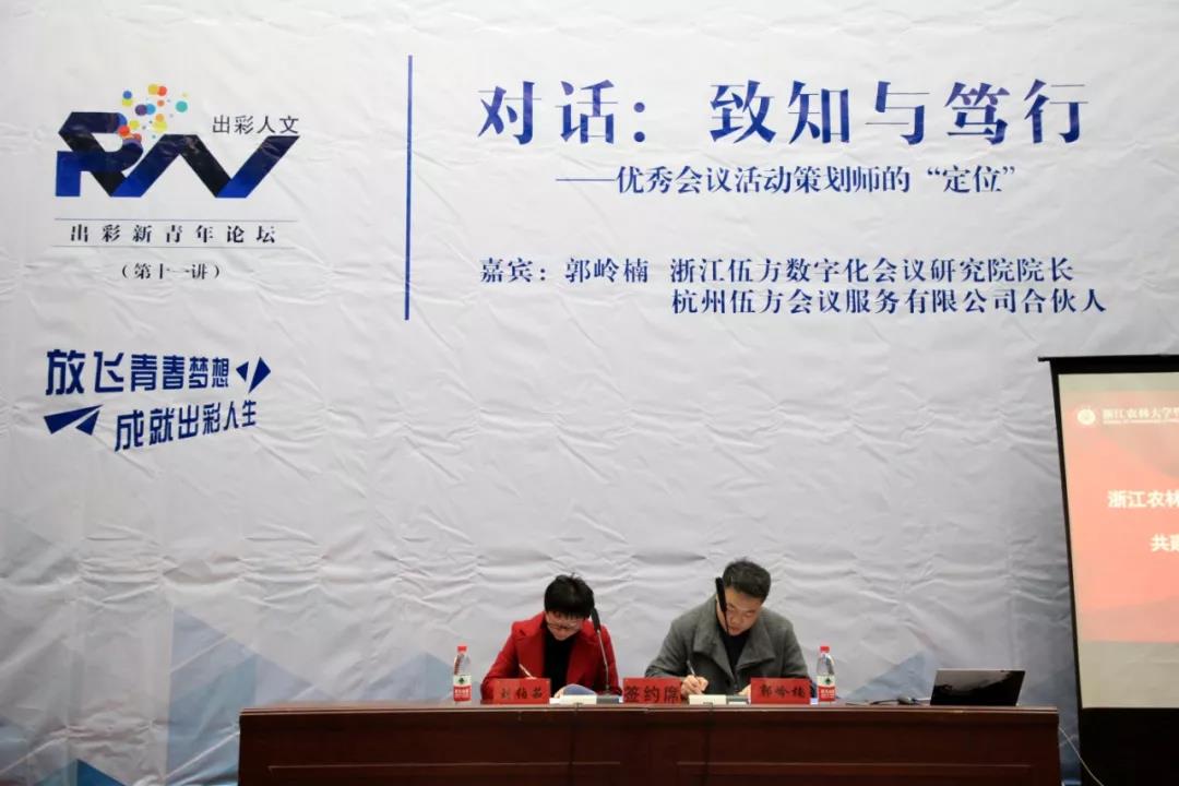 2019年12月11日,浙江伍方數(shù)字化會議研究院院長郭嶺楠受邀前往浙江農(nóng)林大學暨陽學院參加“對話:致知與篤行——優(yōu)秀會議活動策劃師的‘定位’”新青年論壇。