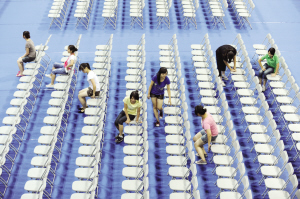 19個身穿制服的志愿者,開始了同一個動作:坐上為嘉賓們準備的椅子,然后搖一搖,確定椅子足夠牢固以后,再坐到另一張椅子上,重復(fù)同樣的動作。
